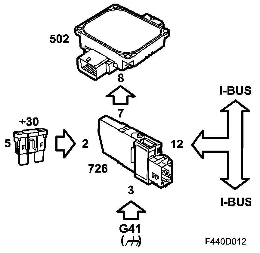 The SLM control module is powered with +30 on pin 2 from main fuse box 22, fuse 5. Grounding takes place on pin 3, grounding point G41. Bus communication (I-bus) takes place on pin 12. Communication regarding up or down shifting in position "M" takes place from pin 7 on SLM to pin 8 (A) on TCM.
