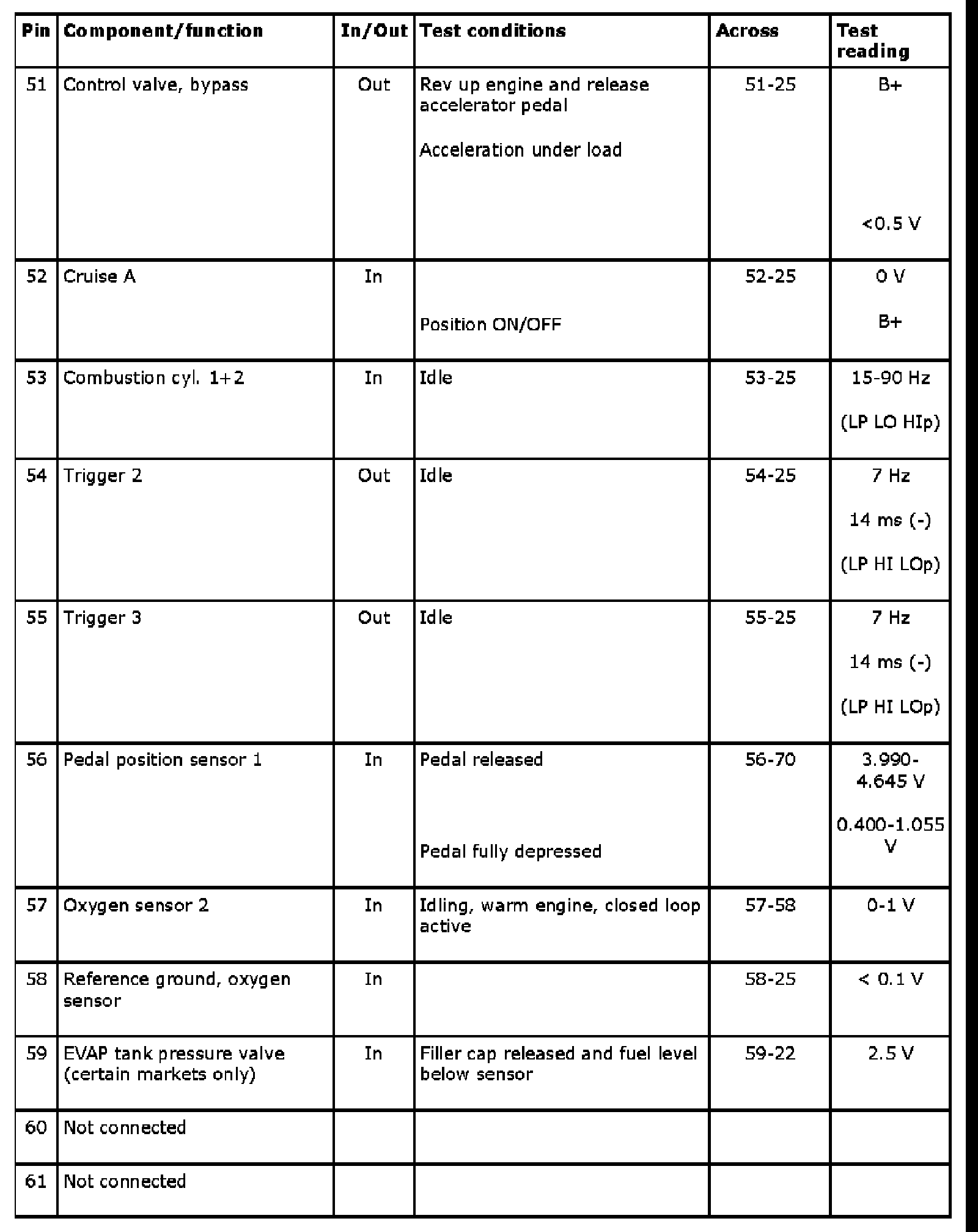 The following tables contain readings and directions for measuring signals and levels on the Trionic control module.