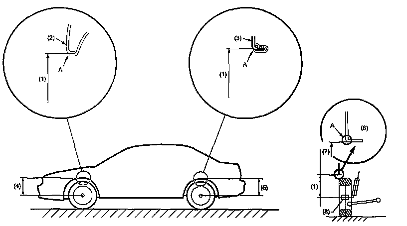 Mark each right and left tires at height corresponding to center of spindle and measure the distance "A" between marks.