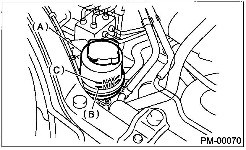 - Check the fluid level using the scale on the outside of reservoir tank (A). If the level is below "MIN" (B), add fluid to bring it up to "MAX" (C).