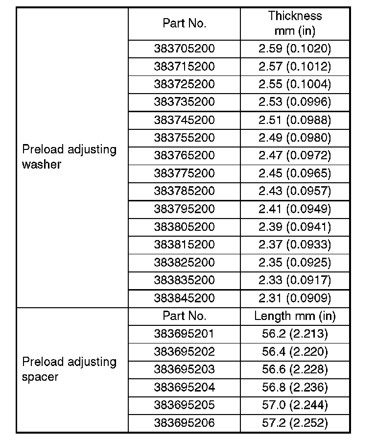 Adjust the bearing preload with spacer and washer between front and rear bearings. Pinion height adjusting washer are not affected by this adjustment. The adjustment must be carried out without oil seal inserted.