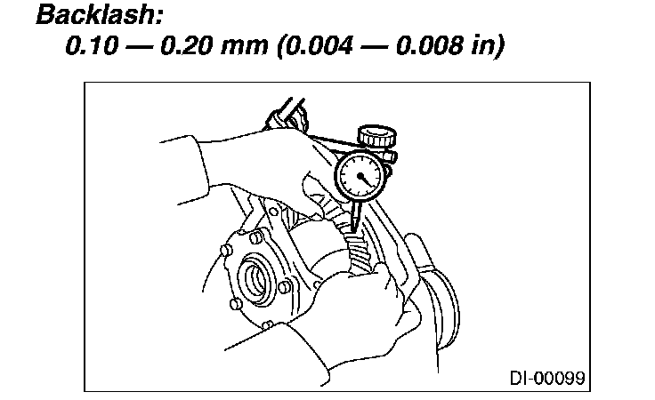 If the backlash exceeds 0.20 mm (0.008 inch), reduce the thickness of shim on the back face of hypoid driven gear and increase the thickness of shim on the tooth face of hypoid driven gear. If the backlash is less than 0. 10 mm (0.004 inch), increase the thickness of shim on the back face of hypoid driven gear and reduce the thickness of shim on the tooth face of hypoid driven gear.