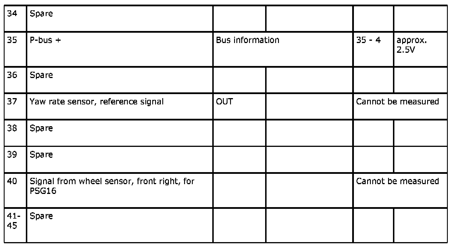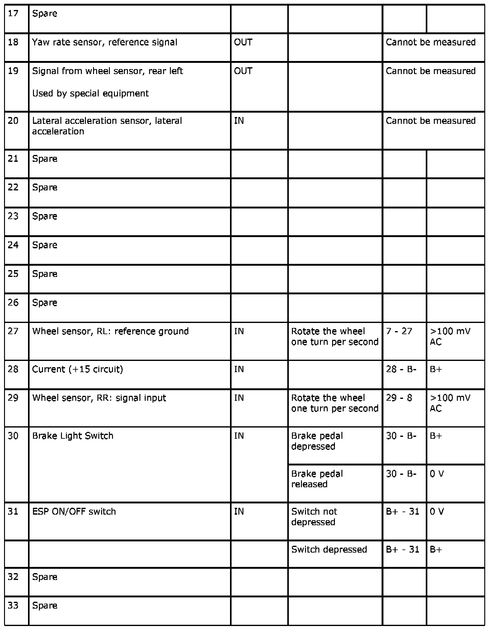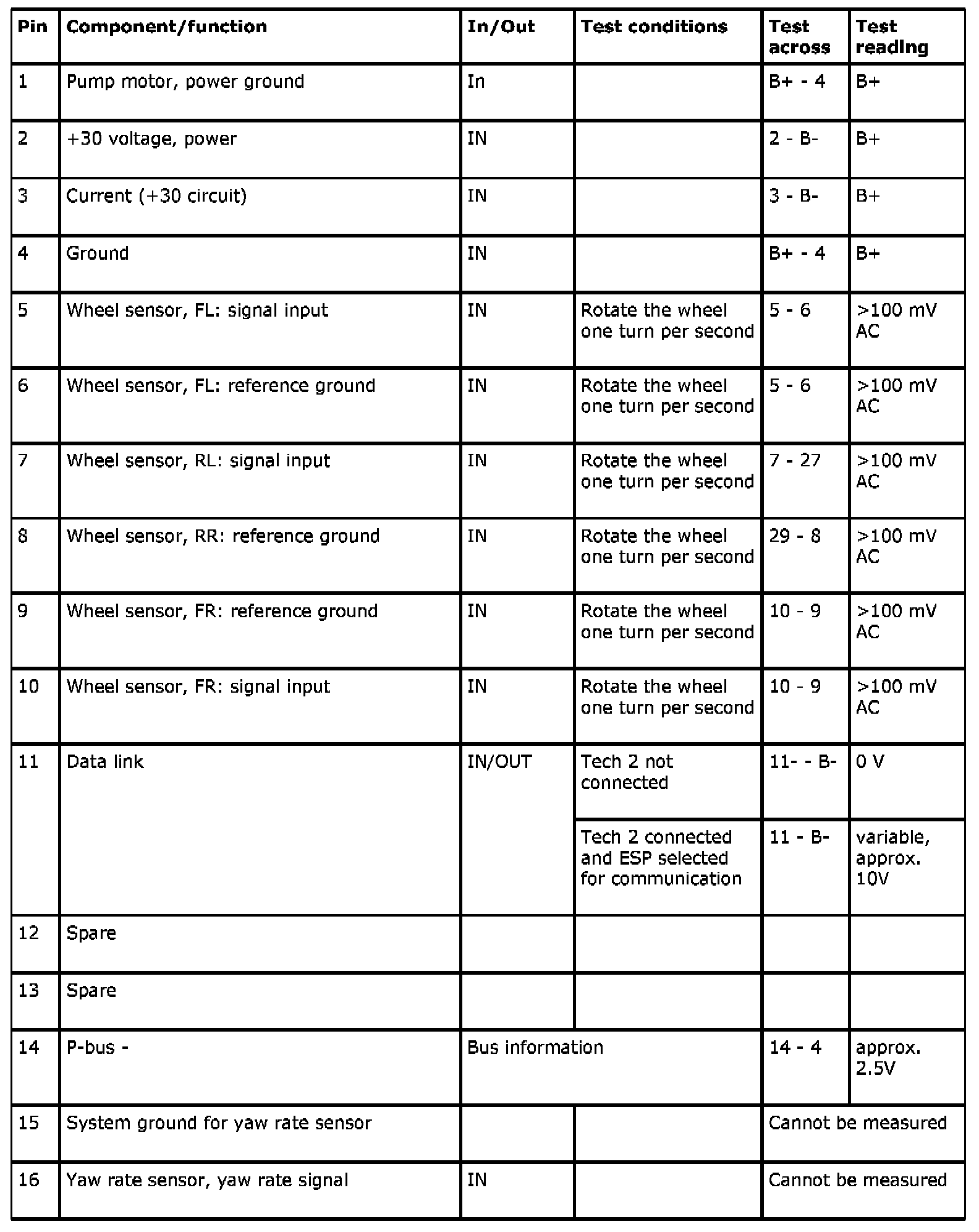 Note: A BOB cable assembly has not been produced for ESP. Unless otherwise stated, the test readings are those that should be obtained on the control module connector (unplugged).