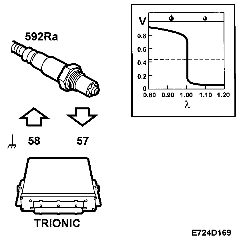 When the exhaust gases pass the oxygen sensor, their oxygen content is measured by a chemical reaction. The output voltage of the oxygen sensor is proportional to the current oxygen content, which is an indication of the composition of the air/fuel mixture. If the engine receives a richer mixture than normal (lambda below 1), the oxygen sensor output voltage will be approx. 0.9V. If the engine fuel mixture is leaner than normal (lambda above 1), the oxygen sensor output voltage will be approx. 0.1V.