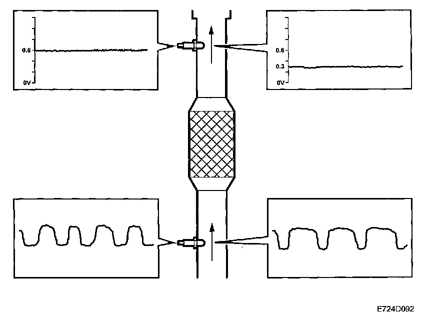 If the catalytic converter is damaged, its ability to absorb oxygen will deteriorate. The normal fluctuations of the closed loop will then be detected on the voltage from oxygen sensor 2 and a diagnostic trouble code will be generated. The diagnosis is performed once per driving cycle.