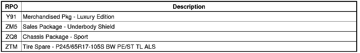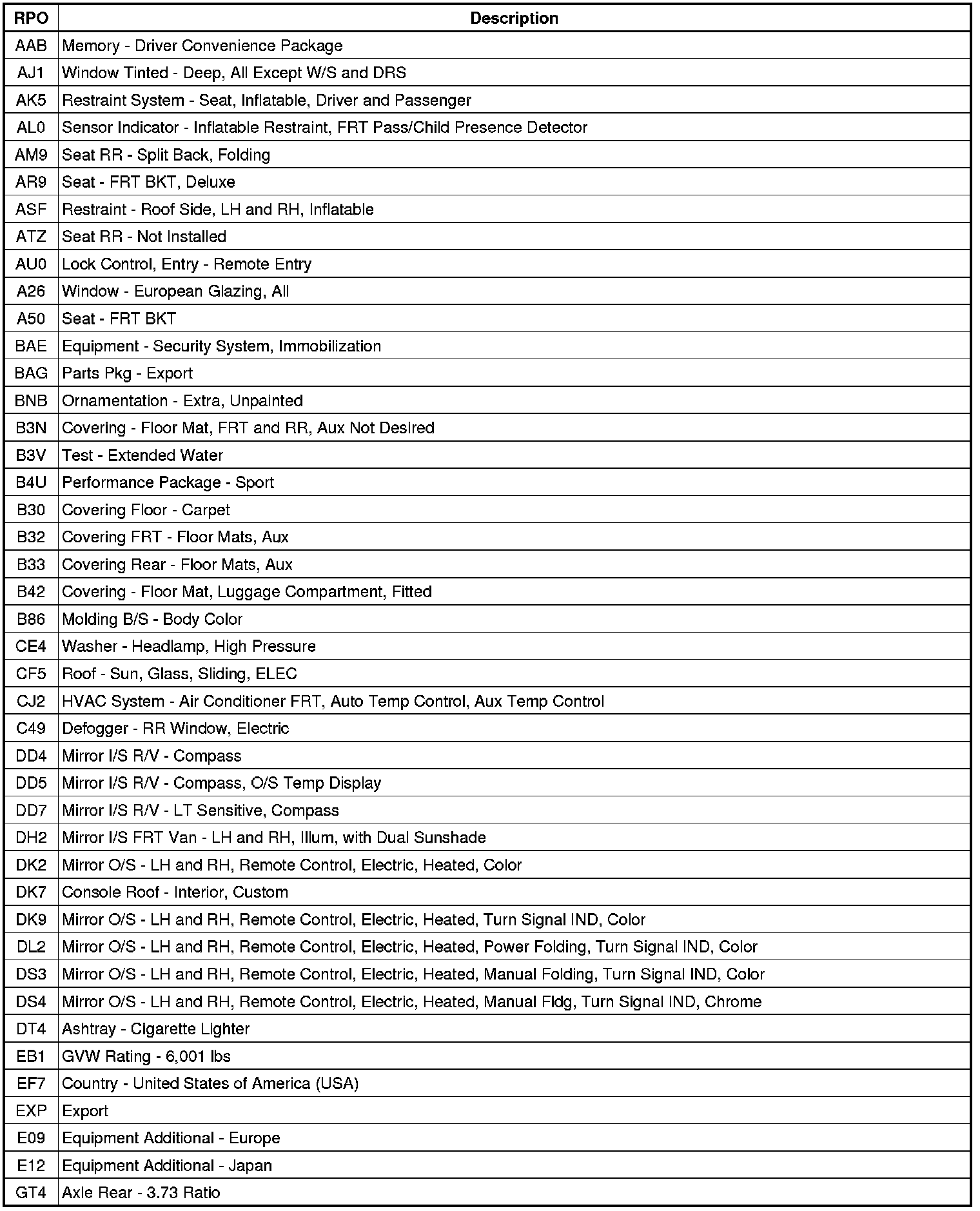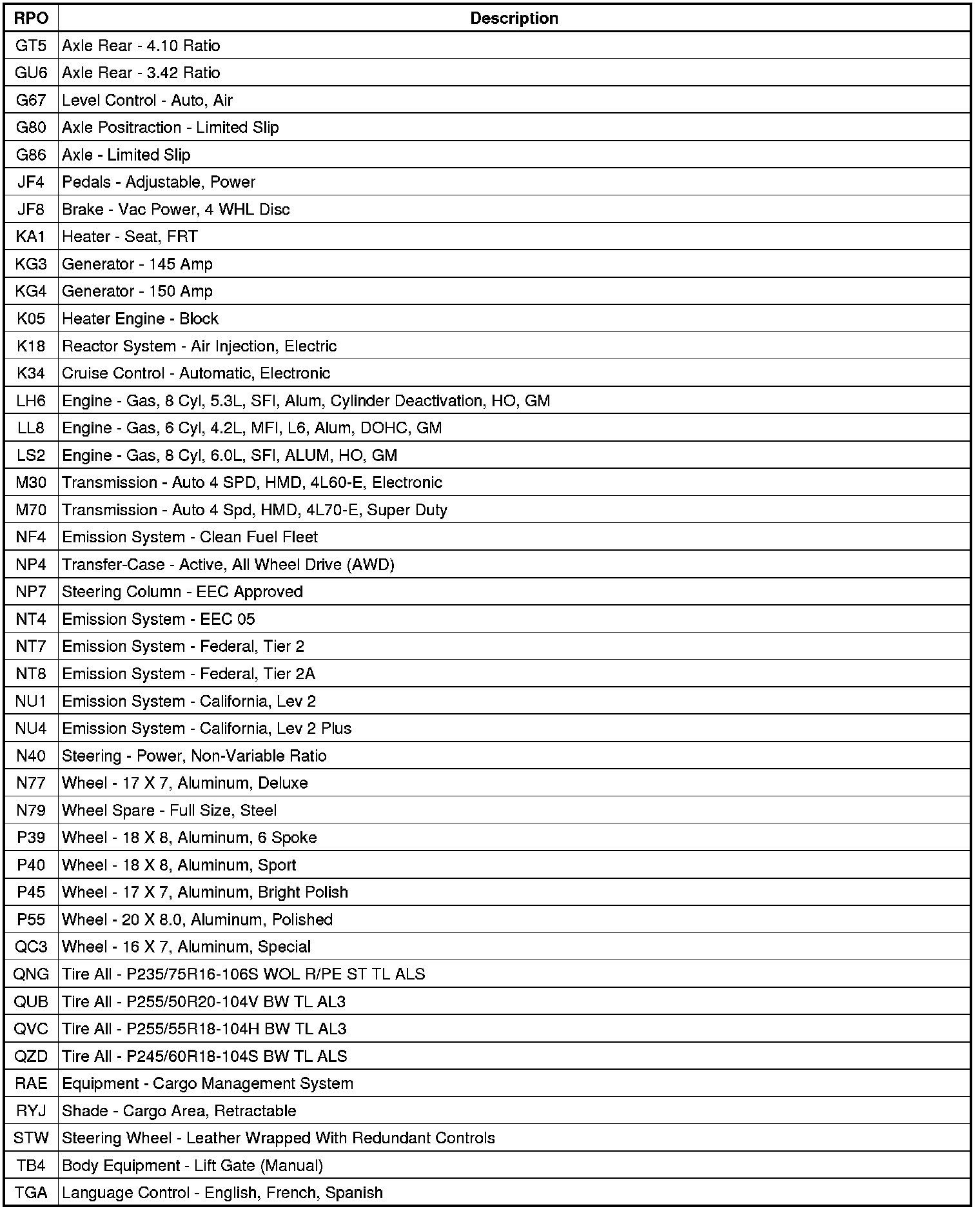 RPO Code List