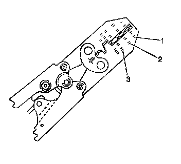 5. Use the Splice Crimp Tool from theJ-38125 in order to position the DuraSeal splice sleeve in the proper color nest of the Splice Crimp Tool. The crimp tool has three nests, 1 is for the salmon and green splice sleeve, 2 is for the blue splice sleeve, and 3 is for the yellow splice sleeve.