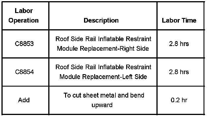 The service part for left and right side Module RF S/RL InfI Rst has been superseded to the most current production part which has a different shaped discharge tube that creates an interference fit with earlier model vehicles (vehicles built prior to January 2007 will need this modification). The inner roof will come in contact with the inflatable restraint module tube and will not allow installation. Refer to the illustration. Follow the service procedure below for inner roof panel modification and installation above.