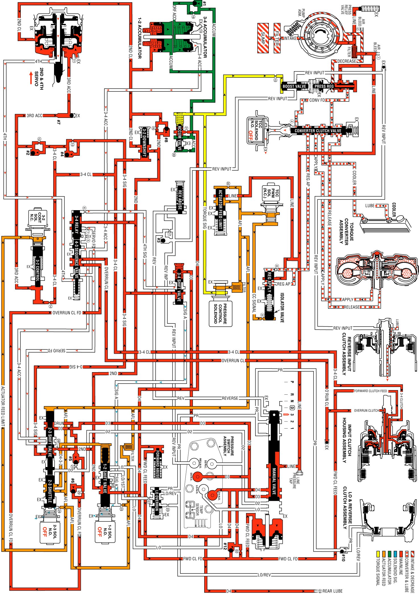 4th signal fluid pressure is exhausted from the end of the 3-4 relay valve. Overrun clutch feed fluid pressure assists spring force and closes both valves. This allows overrun clutch feed fluid to flow through the 4-3 sequence valve and fill the overrun clutch fluid circuit.