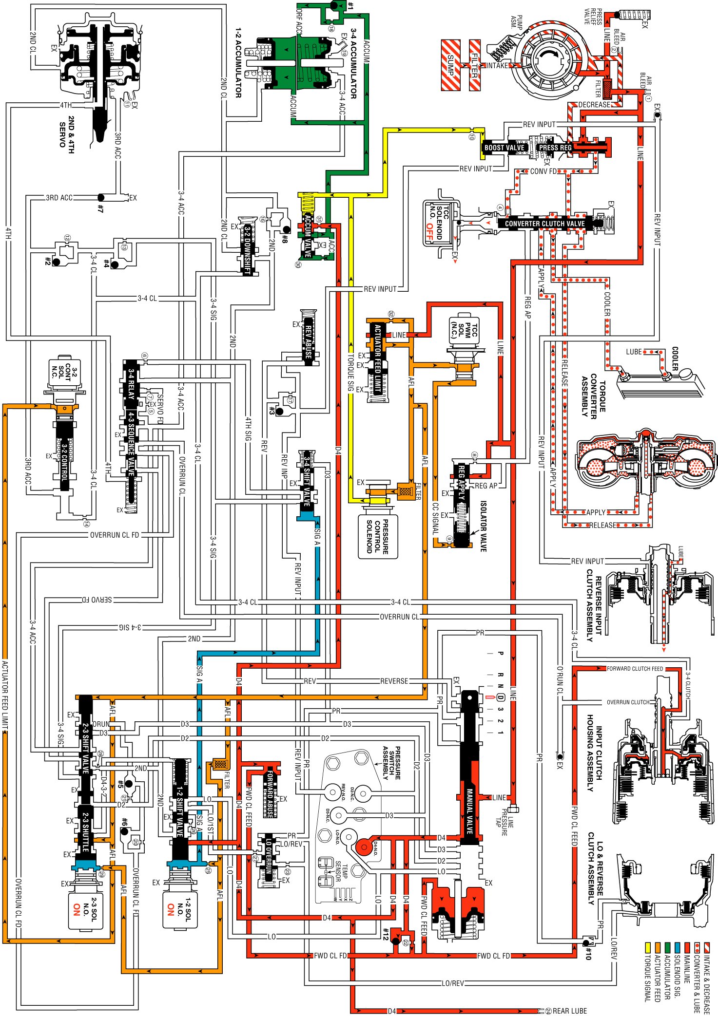 The PCM keeps the solenoid OFF in First gear and the normally closed solenoid blocks filtered AFL fluid from entering the 3-2 signal fluid circuit.