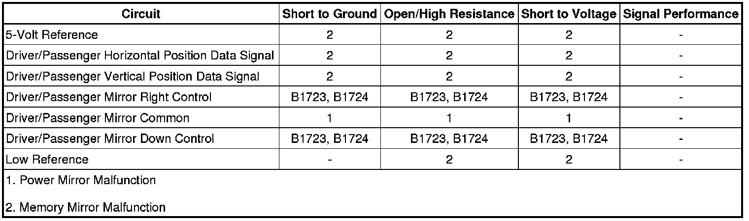 • If either mirror does not move in all commanded directions, refer to Mirror Motor Circuit Malfunction.