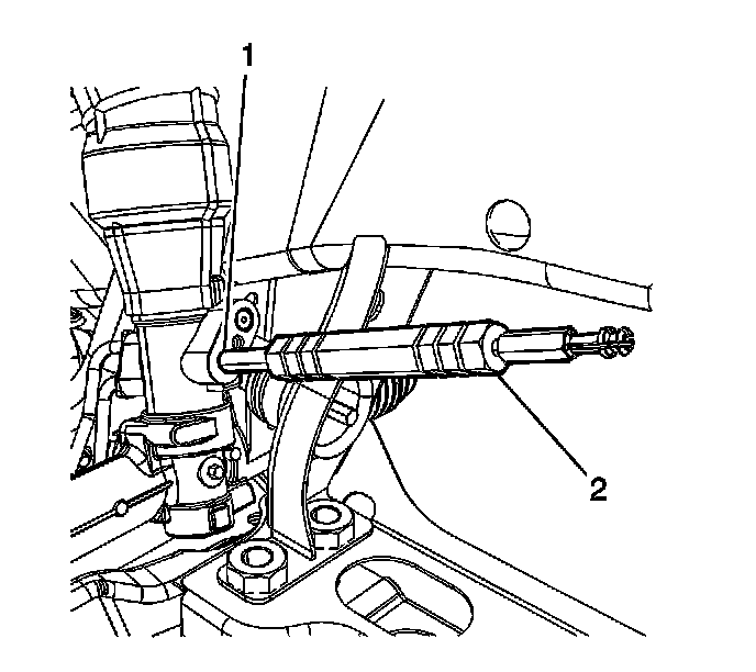 14. Install the seal extraction end of the J 44586 (2) to the power steering gear oil seal (1).