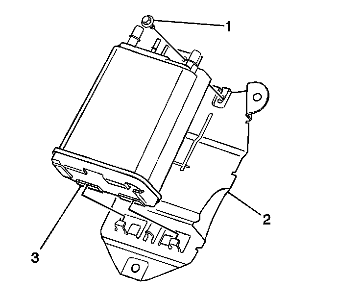 1. Install the EVAP retaining bracket (2) to the EVAP canister (3) ensuring the retaining bracket clip (1) is fully engaged.