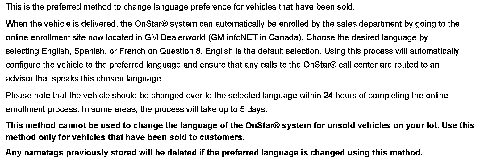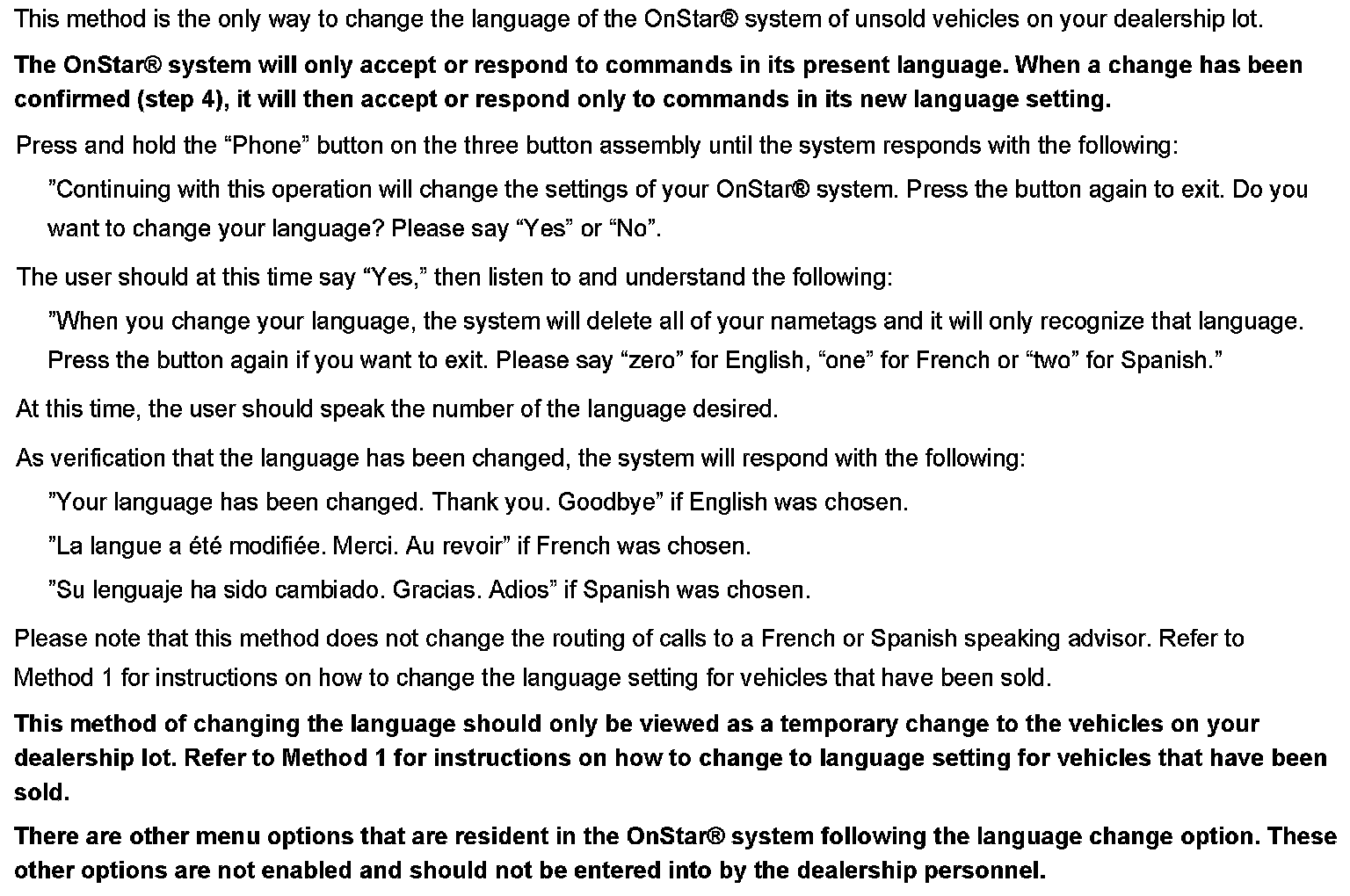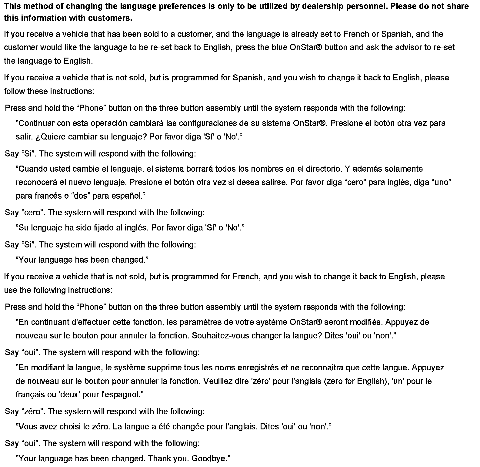 Once completed, this process completely changes all voice recognition and voice commands of the OnStar(R) system. The process will need to be repeated in its entirety to change to a different language, including English.