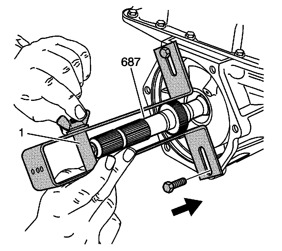 6. Install the J 29837-A as shown. Support the output shaft (687) with adjustable stop (1).