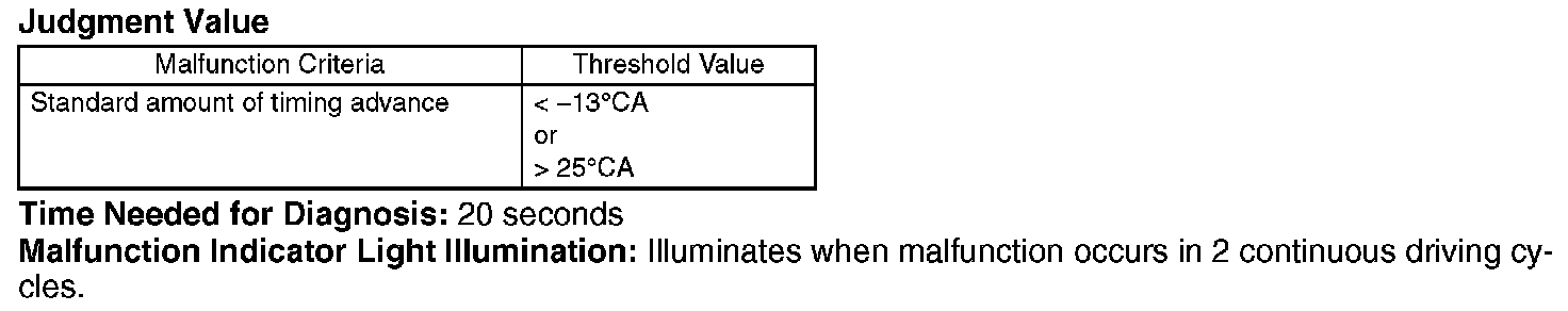 Judge NG when the continuous time of completing the malfunction criteria below becomes more than 20 seconds,and judge OK and clear the NG when the continuous time of not completing the malfunction criteria below becomes more than 1 second.