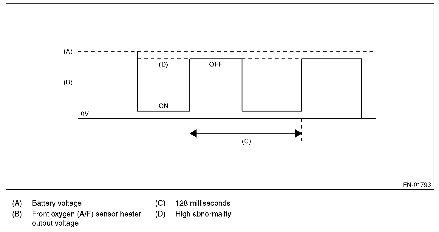 The front oxygen (A/F) sensor heater conducts the duty control. The output terminal voltage at ON becomes 0 V, and the output terminal voltage at OFF becomes battery voltage.