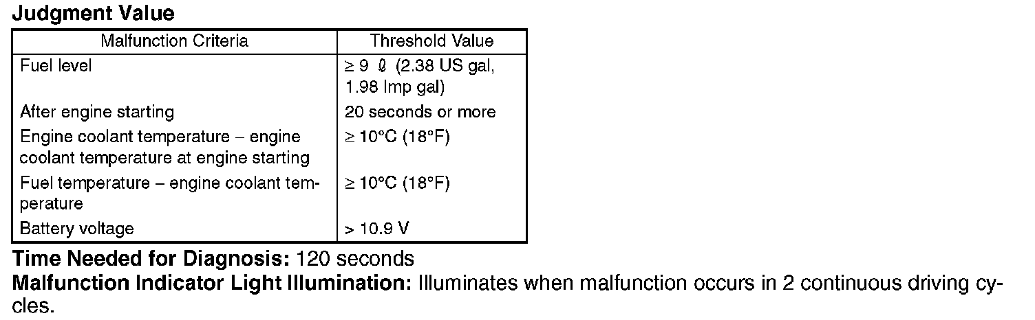 Judge NG when the continuous time of completing the malfunction criteria below becomes more than 120 seconds.