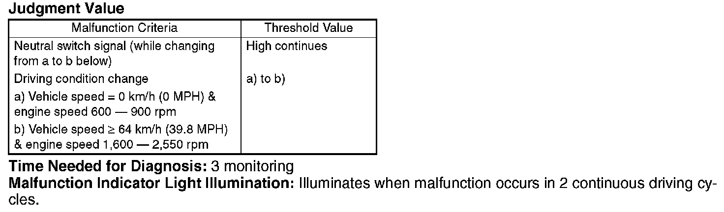 Judge NG when the malfunction criteria below are completed 3 time or more after the neutral SW change. And clear NG if there is change in the neutral SW.
