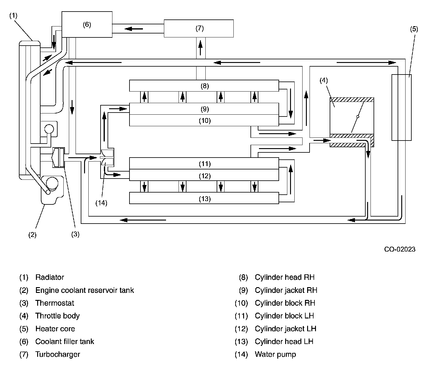 When the engine coolant temperature sensor becomes hotter than the preset value, the ECM receives signals from the engine coolant temperature sensor and causes the radiator fan(s) to operate. When the engine is stopped after high-speed operation, vapor produced in the turbocharger cooling section flows from the coolant filler tank to the reservoir tank where it condenses back into water. Water is then absorbed by the coolant filler tank as the engine cools down.