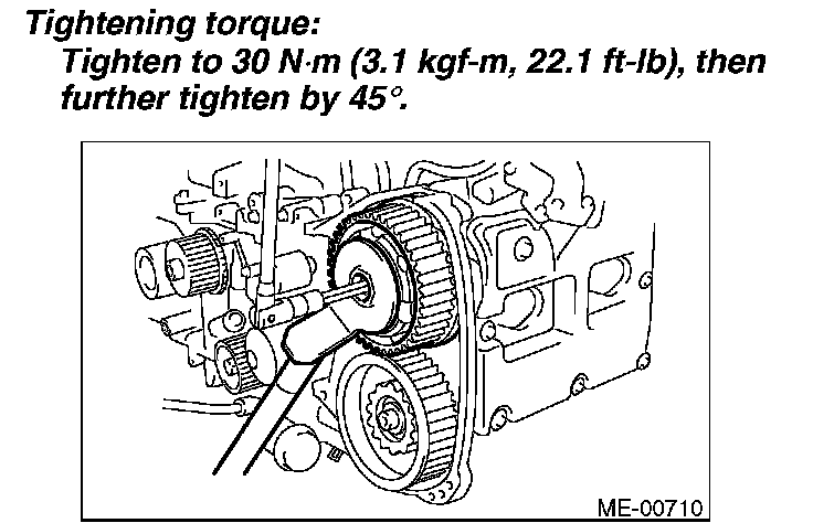Tightening torque: Tighten to 30 Nm (3.1 kgf-m, 22.1 ft. lbs.), then further tighten by 45°