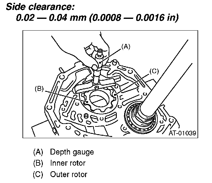 (2) Side clearance Set a depth gauge to oil pump housing, then measure oil pump housing-to-rotor clearances.