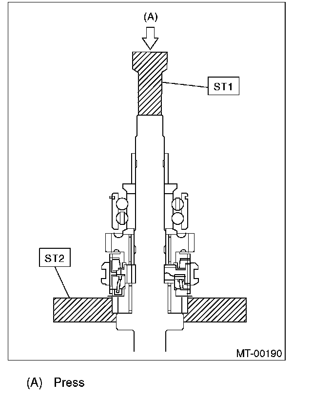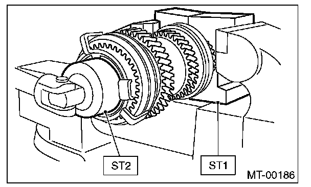 5. Using the ST1, ST2 and a press, remove the ball bearing, synchro cone and baulk ring (Rev).