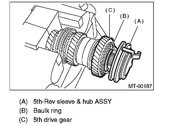 3. Remove the 5th-Rev sleeve & hub assembly, baulk ring, 5th drive gear and needle bearing.