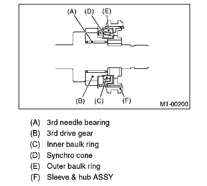 2. Install the 3rd drive gear, outer baulk ring, synchro cone, inner baulk ring, sleeve & hub assembly for 3rd needle bearing on transmission main shaft.