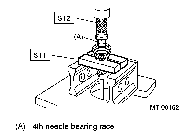 3. Install the 4th needle bearing race onto transmission main shaft using ST1, ST2 and a press.
