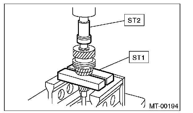 5. Drive the ball bearing onto the rear section of transmission main shaft using ST1, ST2 and a press.