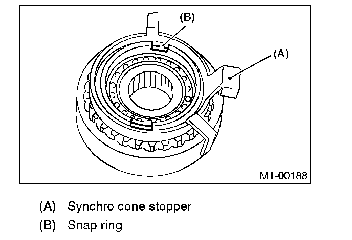 9. Install the synchro cone stopper and snap ring to 5th-Rev sleeve & hub assembly.