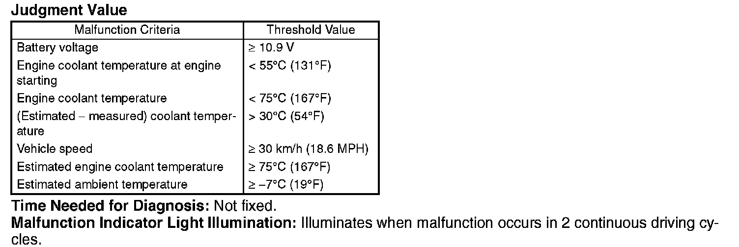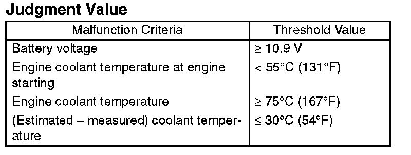Detect the malfunction of thermostat function. Judge NG when the engine coolant temperature is lower than the estimated engine coolant temperature and the difference between them is large. Judge OK when the engine coolant temperature becomes 70 degrees C (158 degrees F) and the difference is small before judging NG.