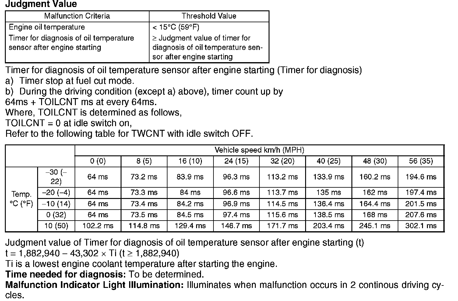 Detect the malfunction of engine oil temperature sensor output property. Judge NG when the engine oil temperature does not increase regardless of the driving condition that engine oil temperature may be thought to increase.