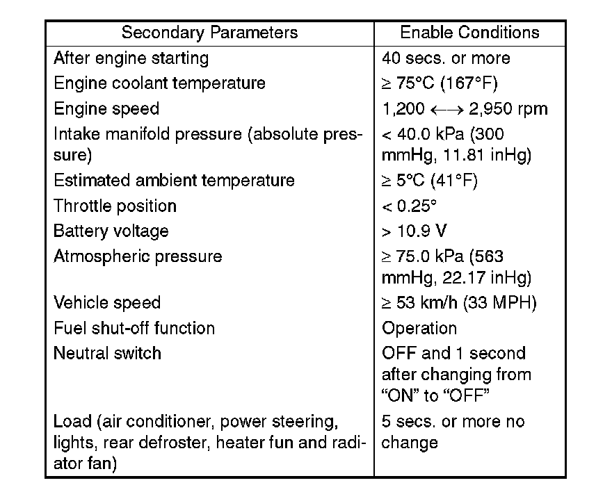 Perform the diagnosis only once at the fuel shutoff in deceleration in vehicle speed more than 53 km/h (approx. 33 MPH). Pay attention to vehicle speed and engine speed. (The diagnosis is not completed if vehicle speed and engine speed are out of condition due to deceleration.)