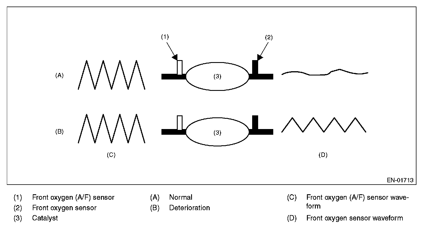 Detect the deterioration of catalyst function. Though the front oxygen sensor output would change slowly with a new catalyst, the sensor output with a deteriorated catalyst becomes high and the inversion time is shortened. For this reason, the catalyst diagnosis is carried out by monitoring the front oxygen sensor output and comparing it with the front A/F sensor output.