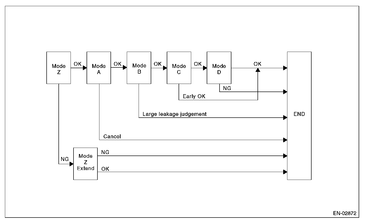 Stop the introduction of negative pressure. (Wait until the tank pressure returns to the start level of P2 calculation.) Change to Mode D when the tank pressure returns to the start level of P2 calculation. Judge immediate OK and change to Mode E when it does not return in spite of spending the specified time.