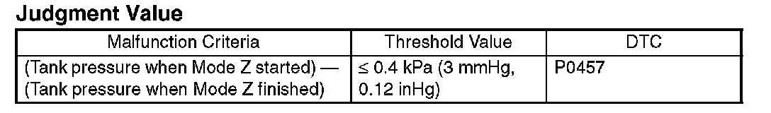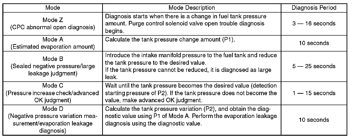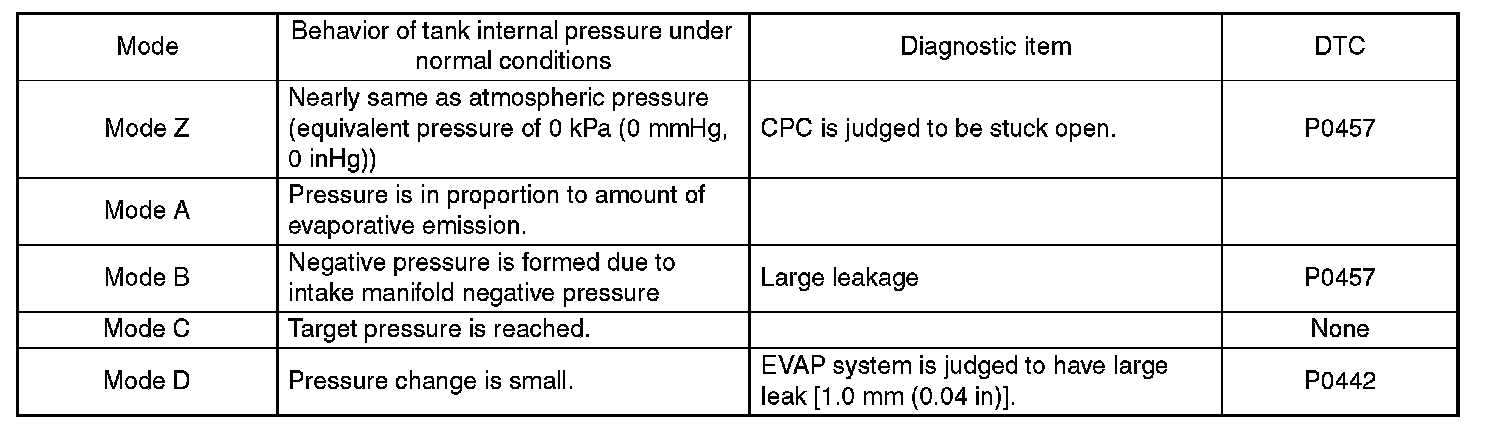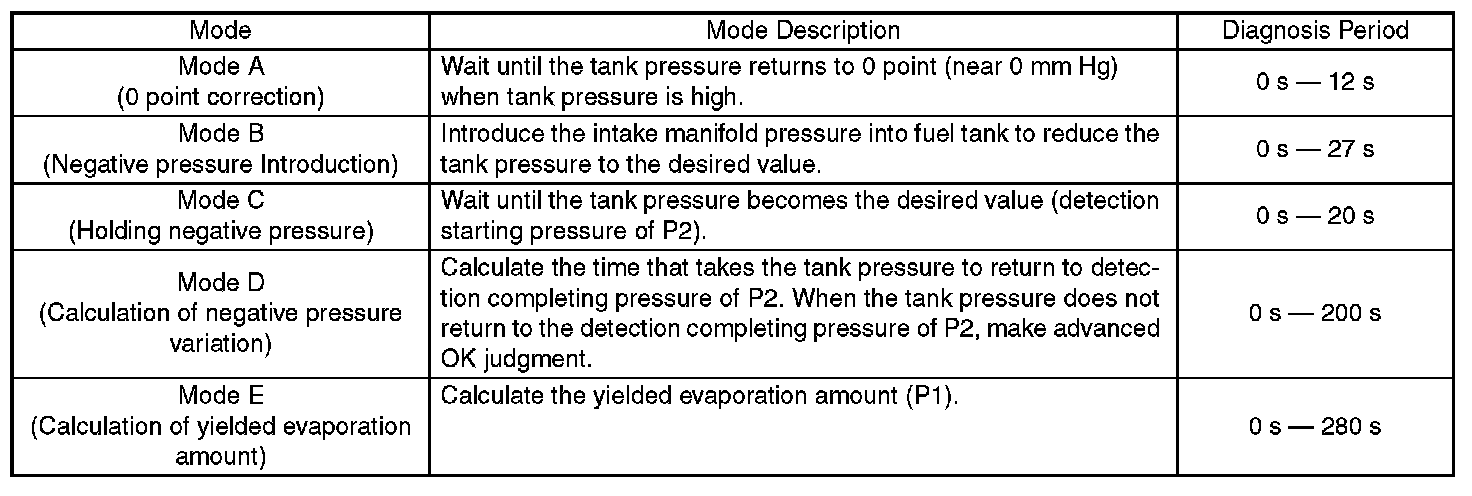 In this system diagnosis, checking for leakage and valve function is conducted by changing the fuel tank pressure, and monitoring the pressure change using the fuel tank pressure sensor. 0.04 inch diagnosis is performed in the order of mode Z, mode A, mode B, mode C and mode D, and 0.02 inch diagnosis is performed in the order of mode A, mode B, mode C, mode D and mode E.