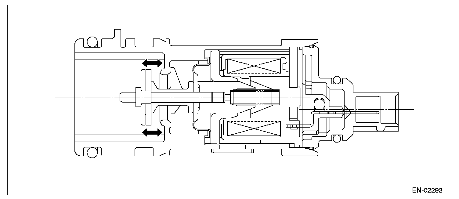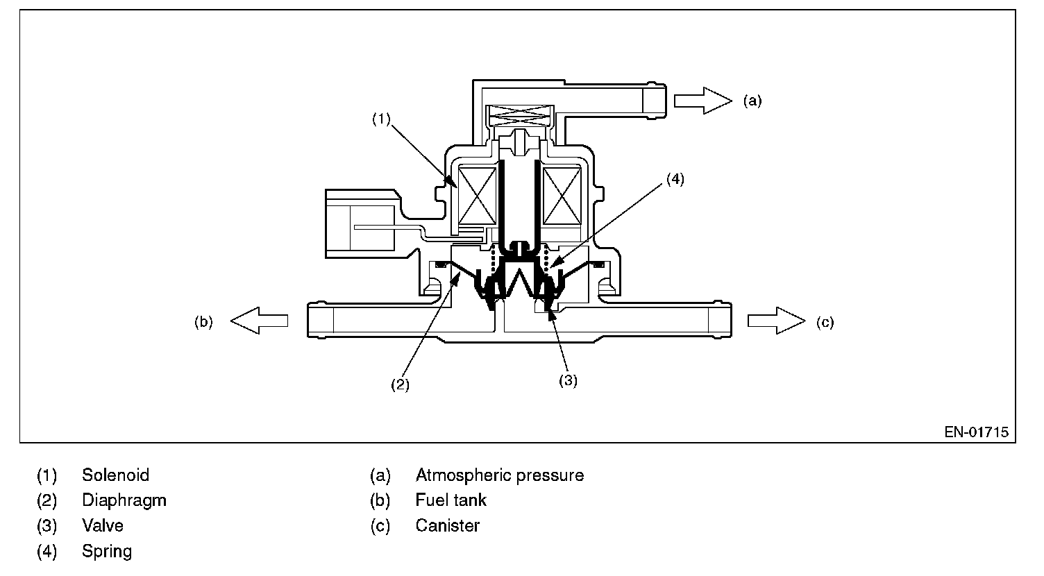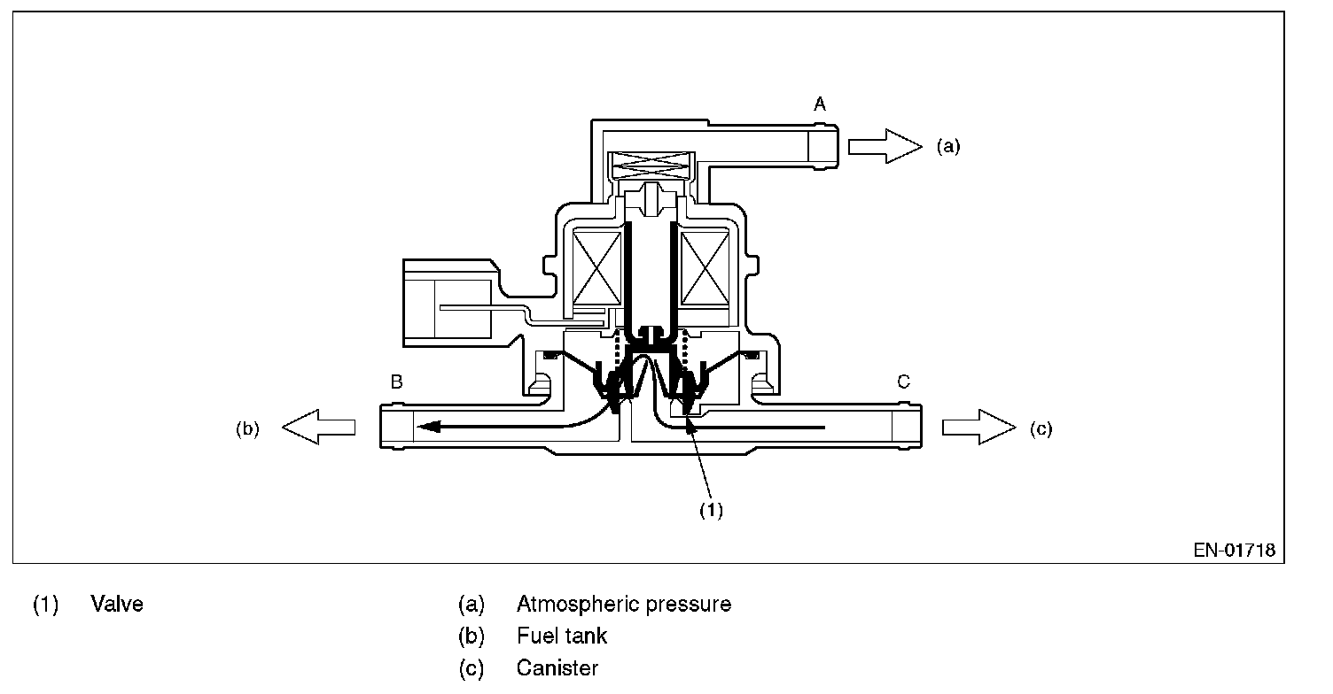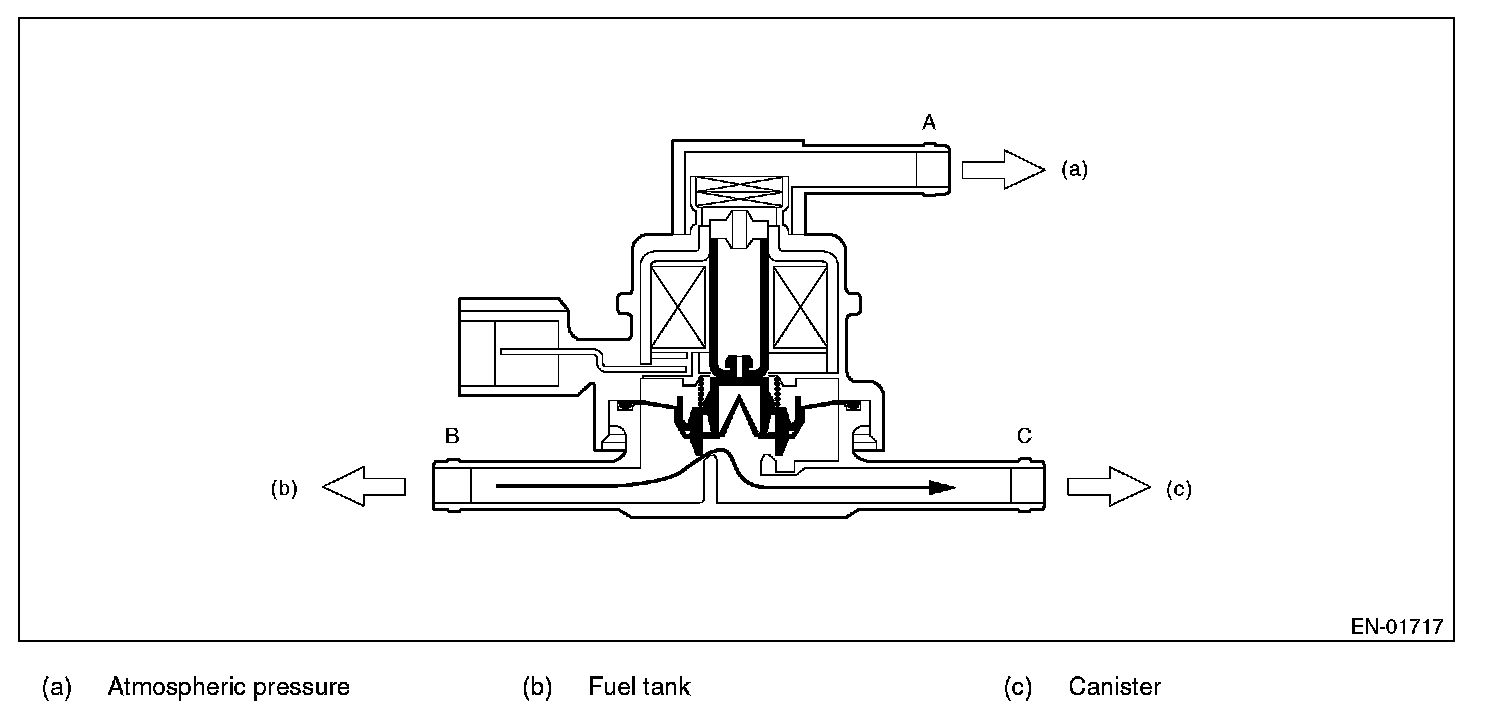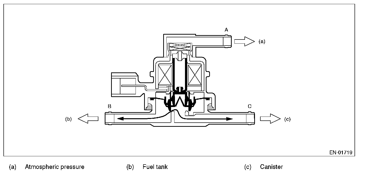 PCV controls the fuel tank pressure to be equal to the atmospheric air pressure. Normally, the solenoid is set to OFF. And the valve opens and closes mechanically in accordance with the pressure difference between tank and atmospheric air, or tank and canister. The valve is forcibly opened by setting the solenoid to ON at the time of diagnosis.