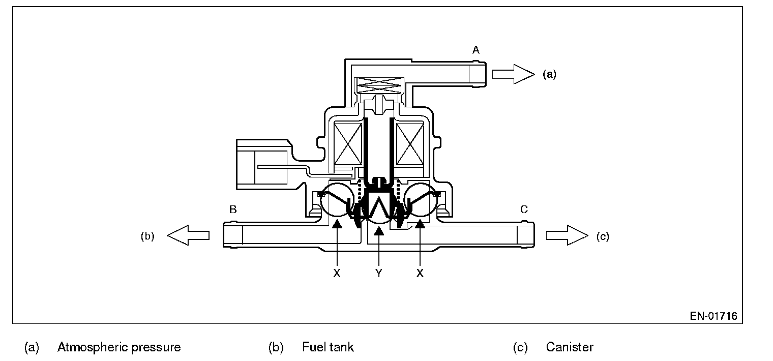 In the figure below, divided by the diaphragm, the part above X is charged with atmospheric air pressure, and the part below X is charged with tank pressure. Also, the part above Y is charged with tank pressure, and the part below Y is charged with canister pressure. If the atmospheric air pressure port is A, tank pressure port is B, and canister pressure port is C, the air flows according to pressure difference from each port as shown in the table below.