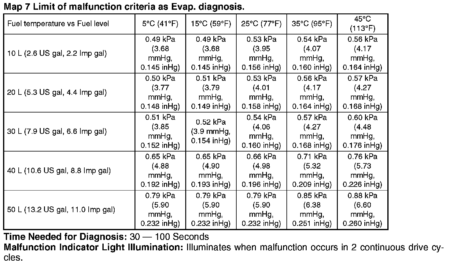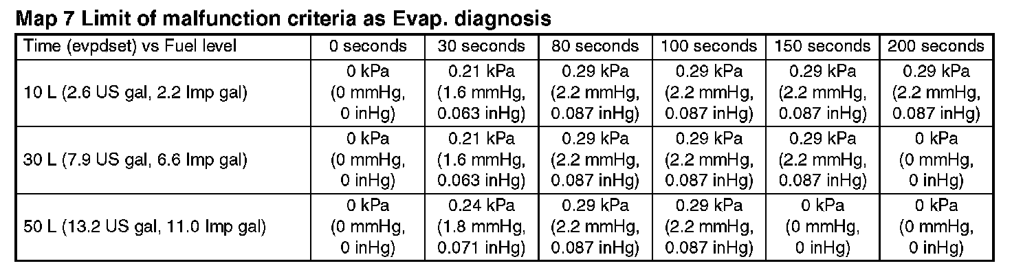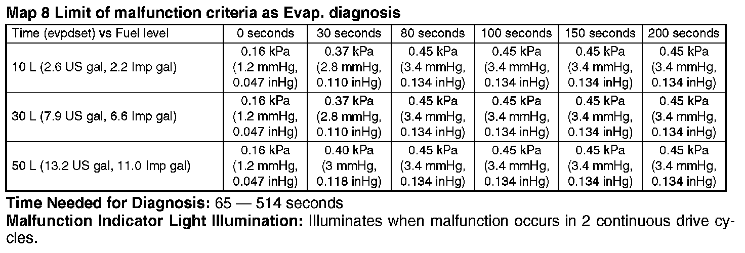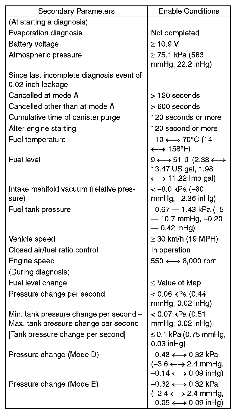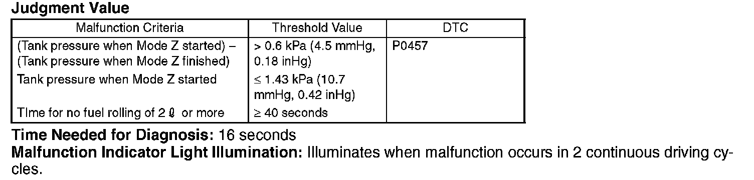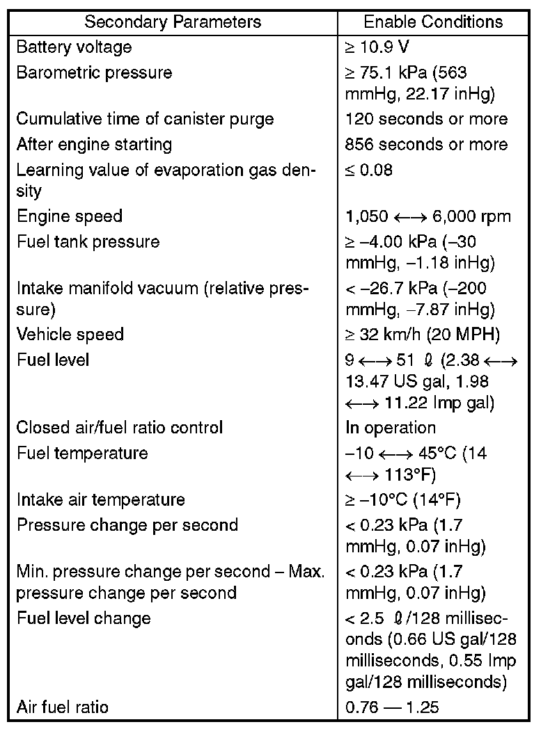 ^ Perform the diagnosis only once in more than 856 seconds after the engine start at the constant driving speed of 32 km/h (20 MPH) or more.
