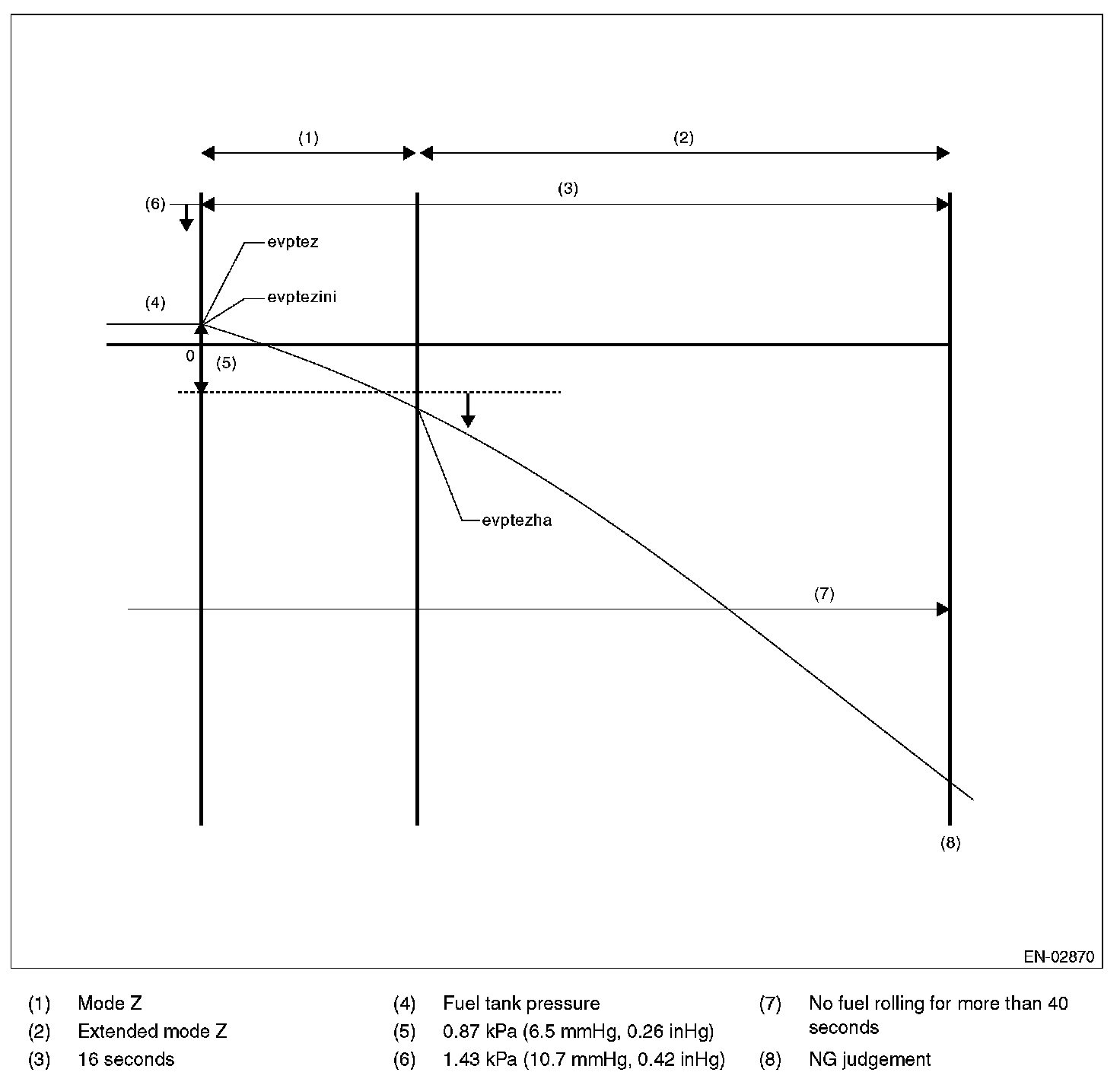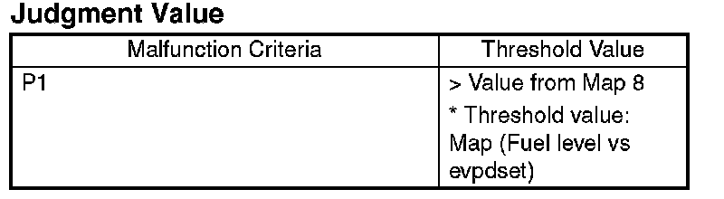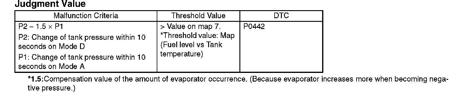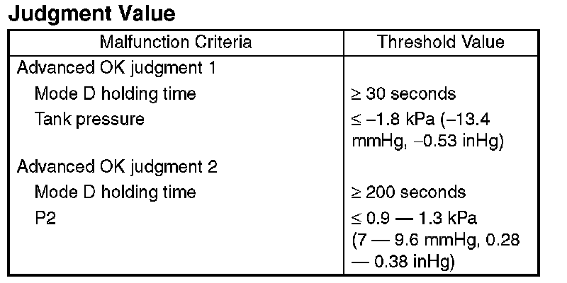 By monitoring the tank pressure at Mode D, calculate the pressure variation (P2) and measure the time (evpdset) it takes the tank pressure to return to the detection completing pressure of P2. Then change to Mode E. When the tank pressure does not return to the detection completing pressure of P2 in the specified time, make advanced OK judgment or cancel the diagnosis according to P2 value.