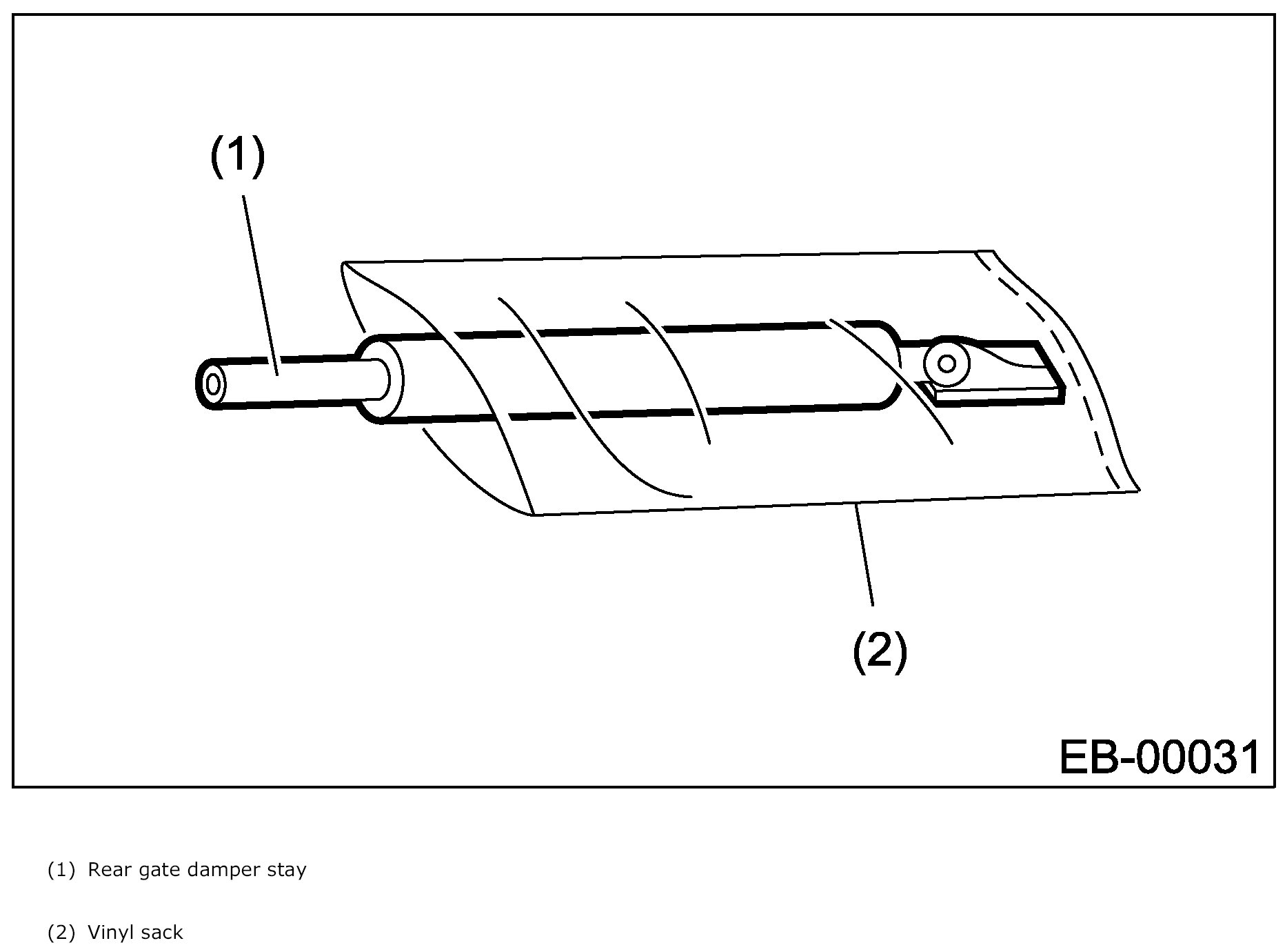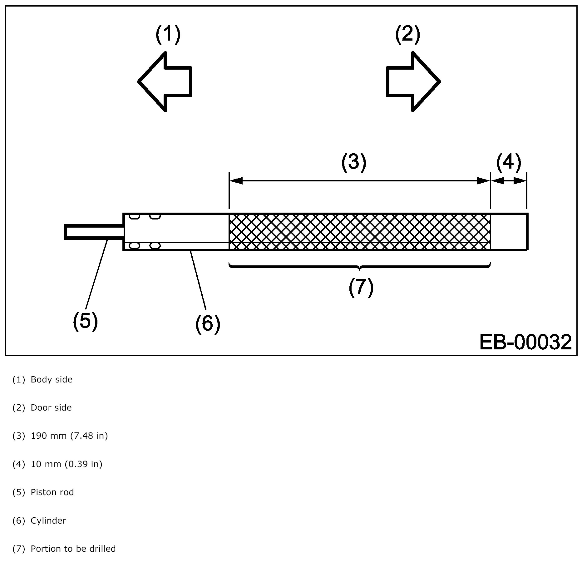 Drill a hole in 2 to 3 mm (0.08 to 0.12 in) diameter at a point 10 to 200 mm (0.39 to 7.87 in) from door side, and bleed the rear gate damper stay completely.