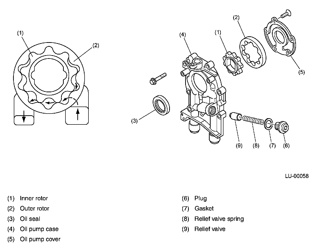 ^ Engine oil is carried from the inlet port to the discharge port. As the pump rotates, the space carrying the oil becomes smaller, thus the oil is pressurized and discharged from the discharge port. A relief valve is built in the oil pump at its discharge side. When the oil pressure becomes higher than the preset value, the relief valve regulates the pressure by sending excessive oil back to the inlet side.