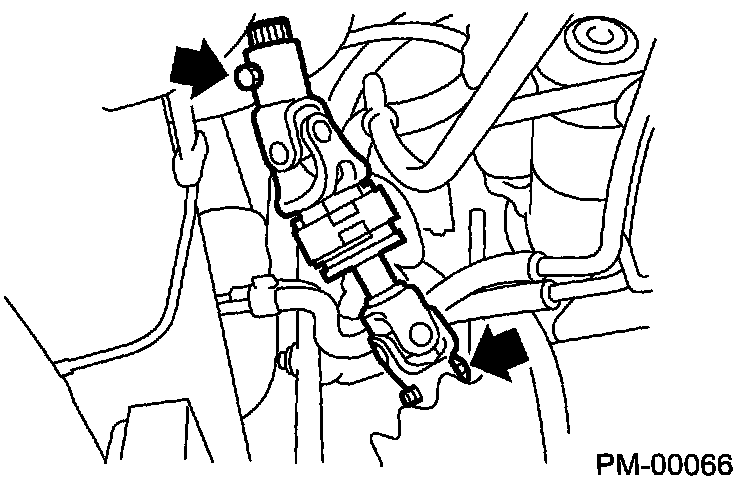 - When the steering wheel free play is excessive, disconnect the universal joint of steering shaft and check it for any play and yawing torque (at the point of the crossing direction). Also inspect for any damage to sealing or worn serrations. If the joint is loose, retighten the mounting bolts to the specified torque.