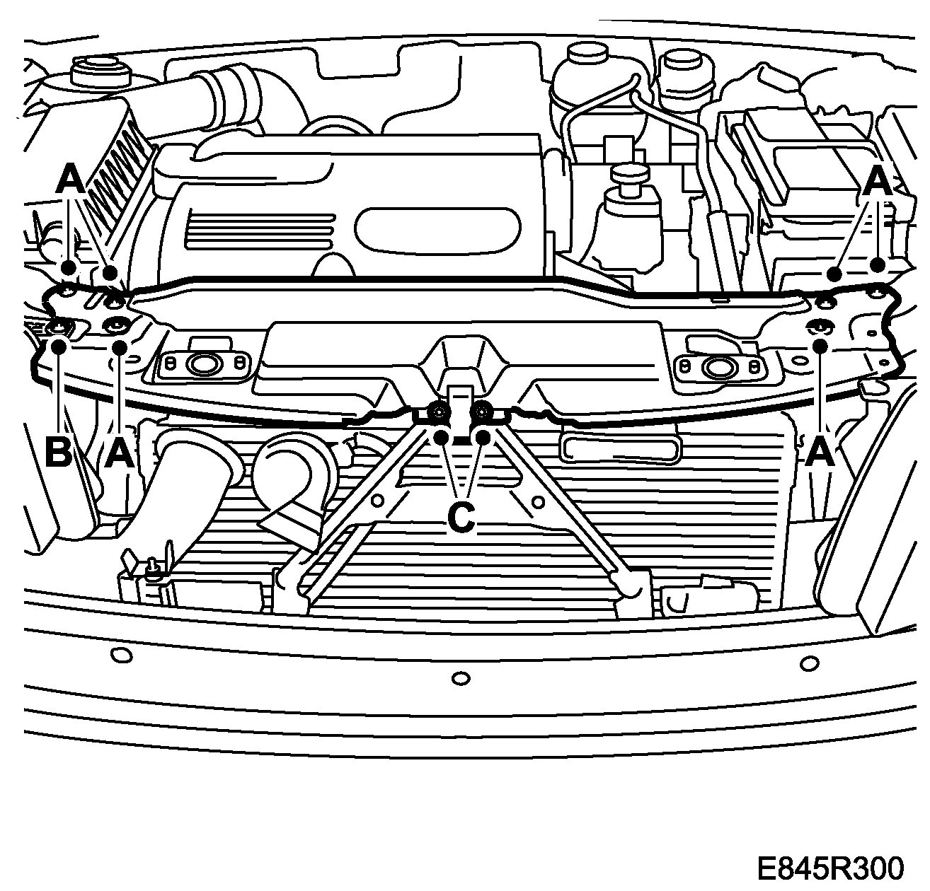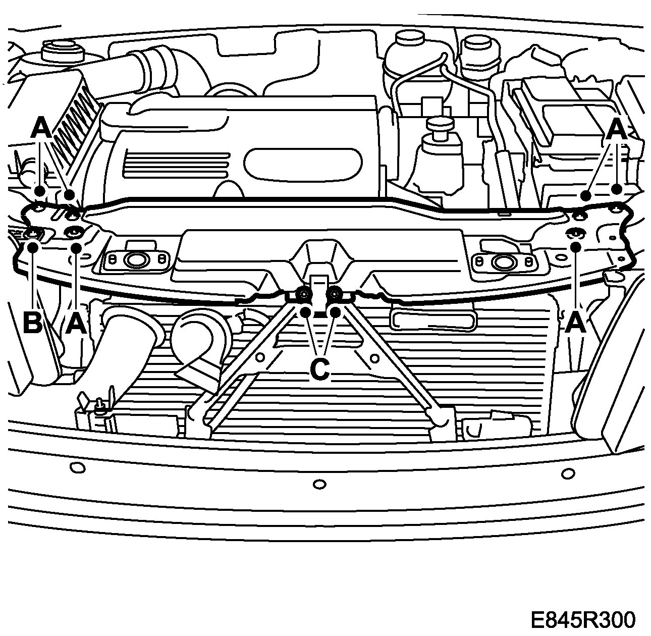 4. Thread the centre stay's bolts (C) and the radiator member's bolt's (A).