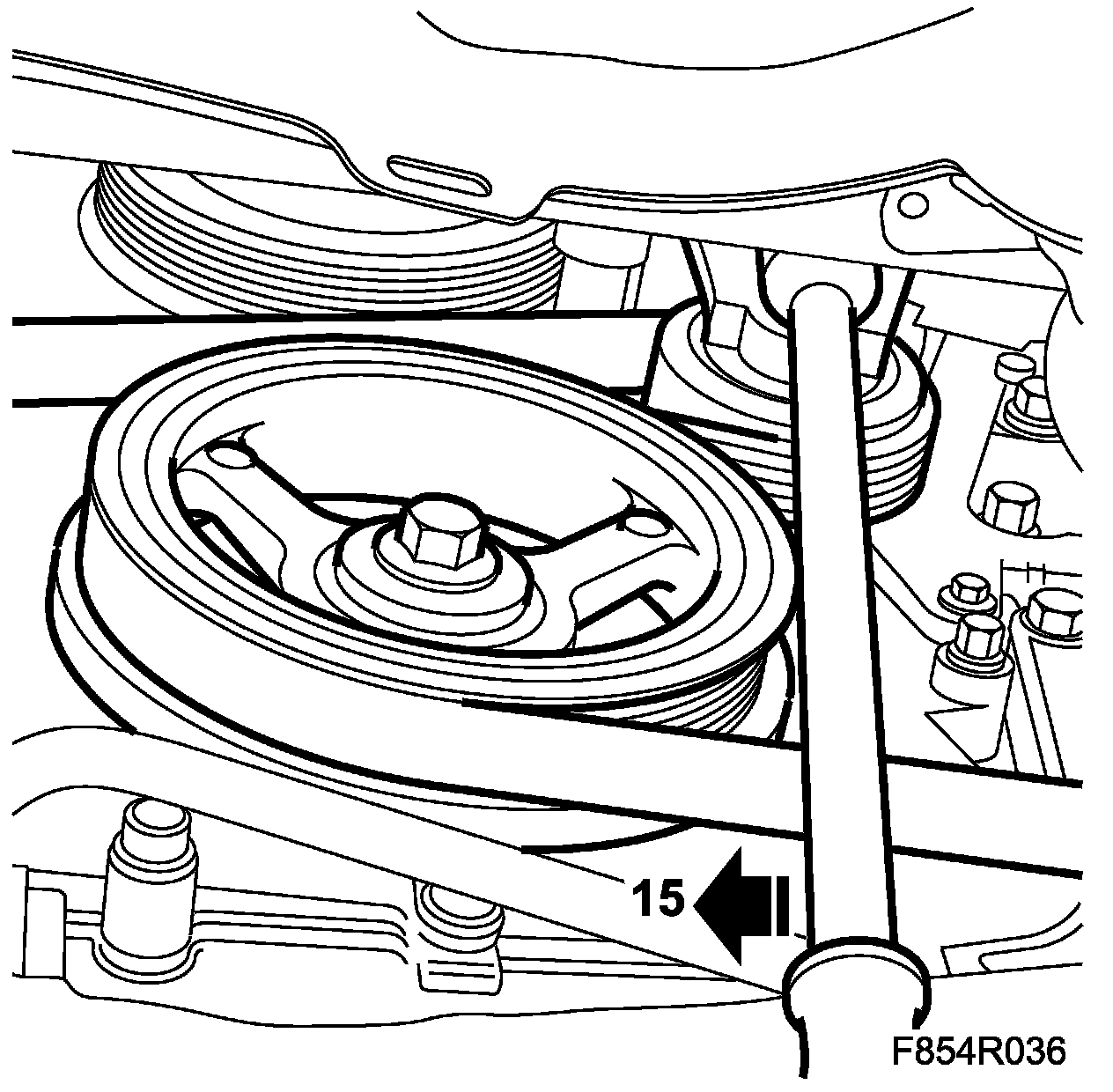 15. Relieve tension on the belt using a 1/2 inch articulated handle and life the belt off of the A/C compressor pulley.