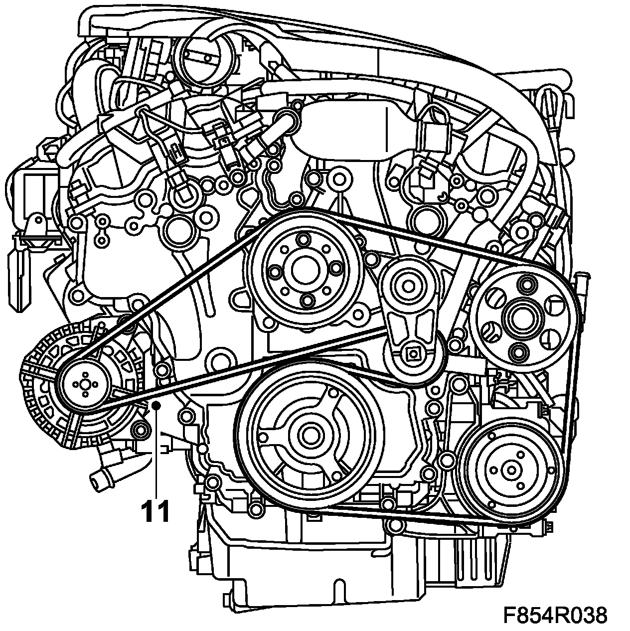 11. Relieve tension on the belt tensioner and fit the belt.