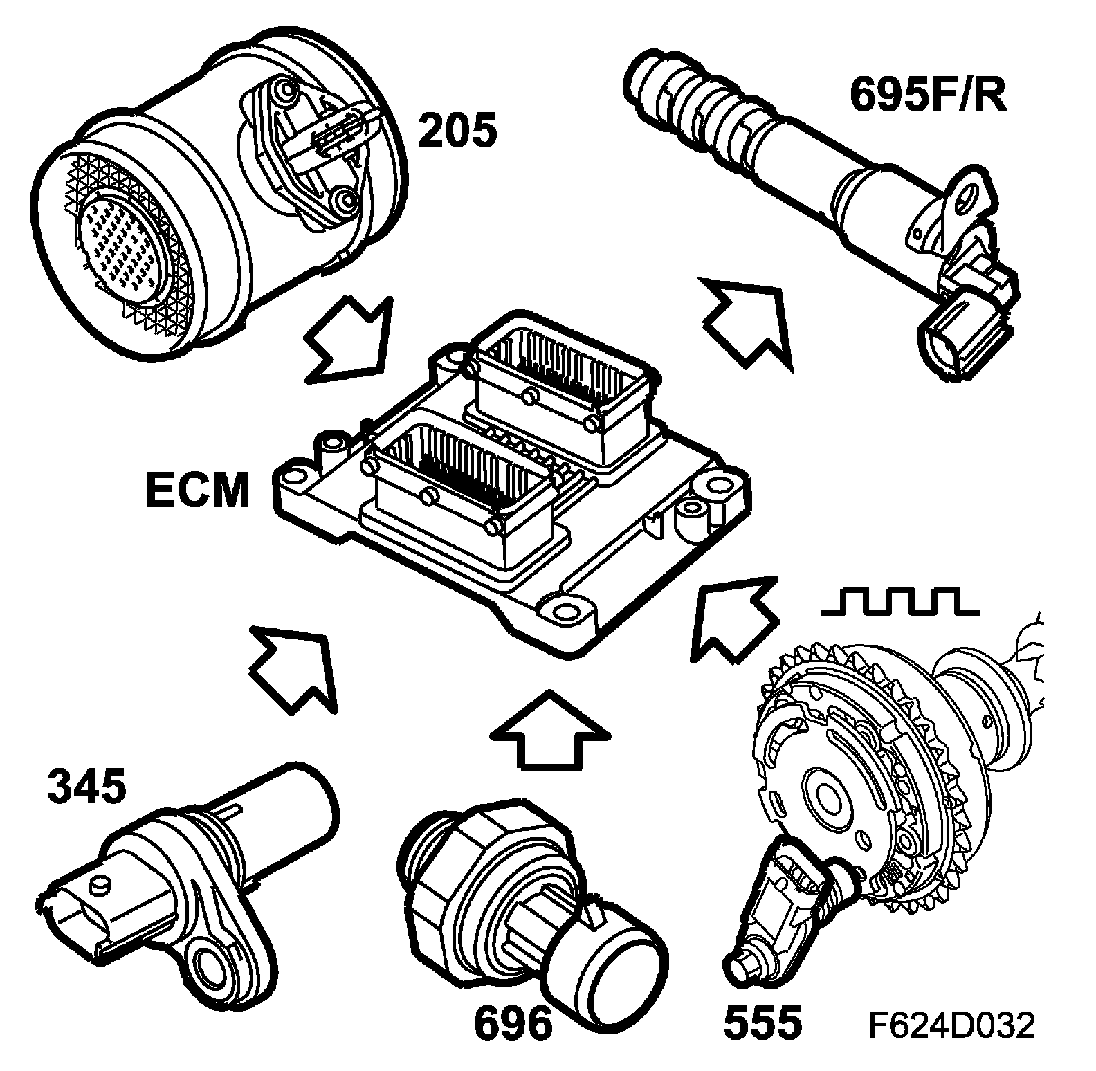 ECM regulates camshaft position based primarily on engine speed and load. A number of other values are used for minor compensations. Based on these values, ECM calculates requested camshaft position, converts it to the necessary PWM value and sends it out to the valves. A Hall sensor reads the position of the aperture discs and thereby the current position of the camshafts. ECM compares the requested and actual positions. If there is deviation, the PWM voltage to the valves is corrected.
