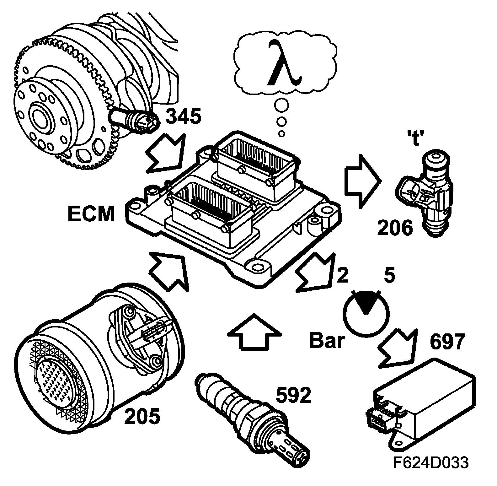 ECM can compare the actual lambda value with the requested one by measuring the actual lambda value in the exhaust flow. Should they deviate, ECM corrects injection timing and, as necessary, fuel pressure.